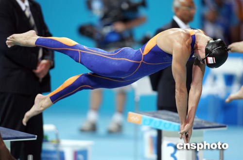 當?shù)貢r間八月二十一日晚,在雅典奧運女子五十米自由泳決賽中,荷蘭名將德布魯因獲得冠軍。中新社記者:毛建軍