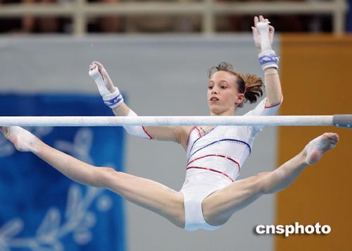 當?shù)貢r間八月二十二日晚,在雅典奧運女子體操高低杠單項決賽中,法國選手勒佩內(nèi)奇以9.687分的成績獲得冠軍。中新社記者:毛建軍