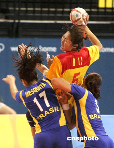 當地時間8月23日下午,在雅典奧運女子手球比賽中,中國女子手球隊(黃)以28比23力克巴西隊。中新社記者:張煒