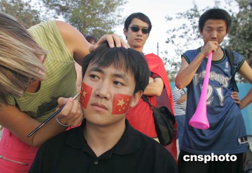 當地時間八月二十六日,一名來自北京的球迷正在雅典排球比賽館附近請人在臉上手繪五星紅旗。雅典奧運會各項賽事接近尾聲,大批來自中國國內的奧運助威團仍活躍在各比賽場館。中新社記者:張煒