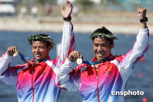 當地時間八月二十八日,中國選手孟關良、楊文軍在雅典奧運男子五百米雙人劃艇比賽中奪得金牌。中新社記者:毛建軍
