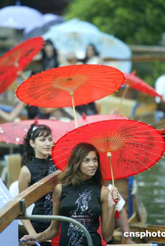 8月31日,參加“時尚杭州之旅”2004年新絲路世界模特大賽的29個國家和地區(qū)的40多名參賽佳麗在浙江省杭州乘木船、撐油紙傘泛舟西湖。世界模特大賽決賽將與9月5日在杭州舉行。中新社記者:盛佳鵬