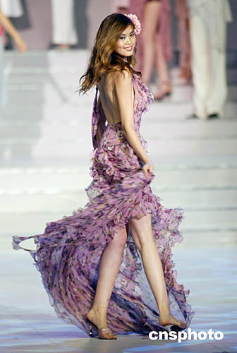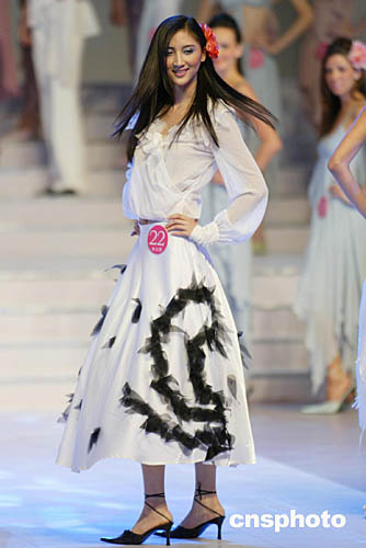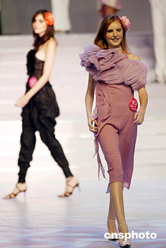 9月5日晚,“時尚杭州之旅·2004年新絲路世界模特大賽”在浙江省人民大會堂舉行,來自二十八個國家的四十七名選手將參加小禮服、泳裝、晚裝展示、情景劇表演以及系列專業技能展示的比賽。中新社記者:盛佳鵬