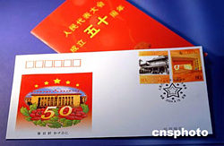 中華人民共和國第一屆全國人民代表大會(huì)第一次會(huì)議于1954年9月15日在北京召開,北京市郵票公司為配合國家郵政局于9月15日發(fā)行《人民代表大會(huì)成立五十周年》紀(jì)念郵票(1套2枚),特設(shè)計(jì)印制了該郵票的首日封(下)、郵折(上)等郵品,將與郵票同日發(fā)行。這套郵票的名稱分別為:一屆全國人大一次會(huì)議在中南海懷仁堂舉行,莊嚴(yán)的人民大會(huì)堂主席臺(tái)。兩枚郵票的面值均為80分。中新社記者:鄒憲