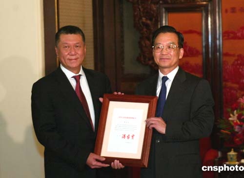 圖:溫家寶向何厚鏵頒澳門特區第二任行政長官任命令