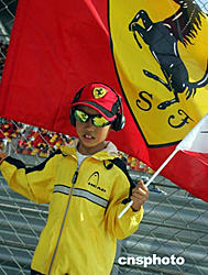 九月二十五日,F1中國站排位賽在上海國際賽車場舉行,吸引數十萬中外車迷。圖為上海小車迷將F1紀念品全副武裝到位。作者:潘索菲