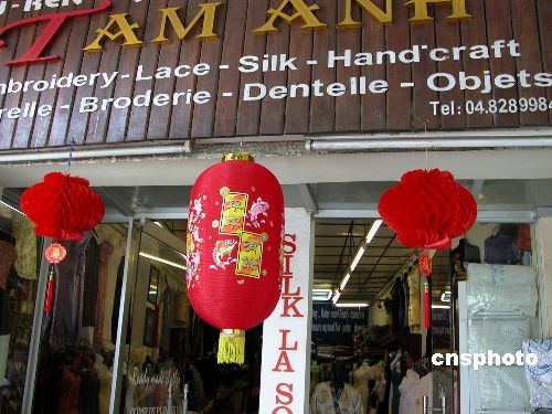 越南文化與漢文化有千年情結。越語中漢文化的影響首先是越南的姓氏,越南人大都有一個漢語化的姓再加上一個名。此外,越南人至今保持著過端午節、春節的習俗。圖為河內街頭的一家服裝店門口掛著大紅的燈籠,燈籠上寫著“年年有余”的漢字。吳慶才 攝