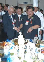 臺灣中華美食交流協會訪問團團長徐旺火(圖右一)一行十一人,二十日出席在福州舉辦的第十四屆中國廚師節暨海峽兩岸美食節開幕式,受到祖國大陸烹飪界人士熱烈歡迎。作者:劉可耕