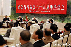 臺盟中央、全國臺聯、全國臺灣研究會十月二十五日在北京人民大會堂舉行座談會,紀念臺灣光復五十九周年。中新社記者:毛建軍