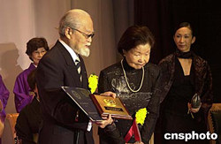 中國駐日本大使館二十五日舉行頒獎儀式,日本松山芭蕾舞團團長清水正夫、松山樹子和舞蹈家花柳千代等三位日本藝術界知名人士榮獲中國文化部頒發(fā)的“文化交流貢獻獎”。作者:王健