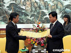 以日本外務省經濟協力局有償資金協力課課長相星孝一為團長的日本政府代表團一行,于二十六日至二十八日到湖南訪問。代表團此行旨在考察湖南人才培養和湘江流域環境污染治理等日元貸款項目。湖南省副省長賀同新(右)將工藝品《岳陽樓記》送給客人。作者:鄧霞