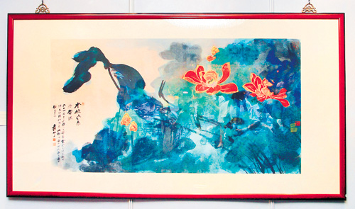 《鉤金紅蓮》以中國畫的顏料采用西洋繪畫法而成