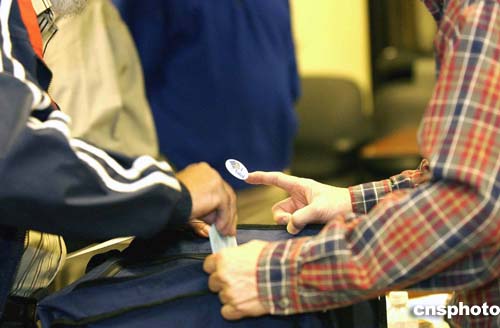 二○○四年大選中已經全面引用先進的電腦屏觸式投票機進行選舉。但仍有選民偏愛紙票。圖為美西時間十一月二日上午,選民把選票投進型似藍布旅行包的大選票箱的情景。作者:陳鋼