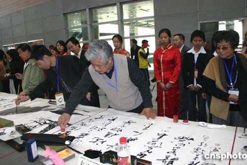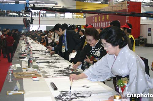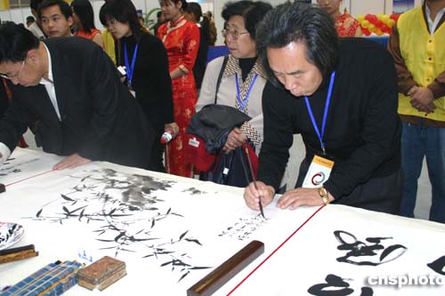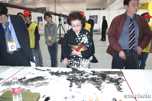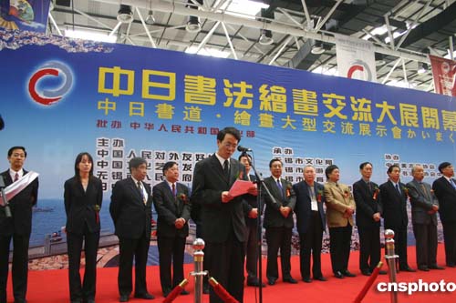 中新網(wǎng)11月6日電(記者邱觀史)為期三天的“中日書法繪畫交流大展”6日在美麗的太湖之濱江蘇無錫拉開帷幕。百名中日書畫家展示他們傾心裝做的200余幅作品,為觀眾獻(xiàn)上極富美感的視覺享受。中國文化部副部長常克仁出席開幕式并發(fā)表講話。