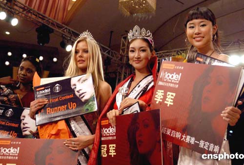 二零零四星際世界模特大賽全球總決賽,十一月十四日晚在廣東珠海舉行,五十位來(lái)自全球四十一個(gè)國(guó)家的專業(yè)模特參加角逐。泰國(guó)選手(中)獲得冠軍,烏克蘭選手(左)獲得亞軍,中國(guó)王琤(右)獲得季軍。作者:劉衛(wèi)勇