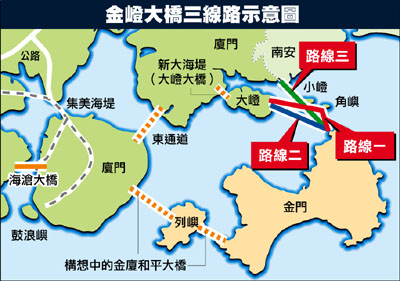 2004年11月金門縣委托顧問公司提出“金嶝大橋”方案,預(yù)計明年8月完成。