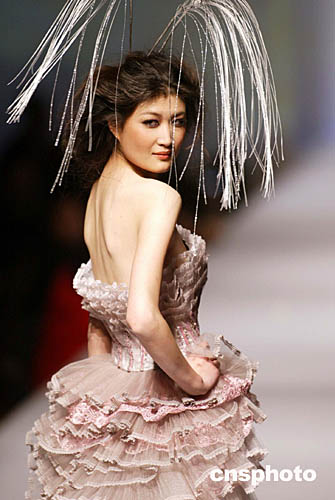 十一月二十一日,一名模特在北京T型臺上演繹時裝設計師羅崢的作品“綻放”,這是二零零四中國國際時裝周上的精彩一幕,獨特的設計令觀眾眼前一亮。中新社記者:盛佳鵬