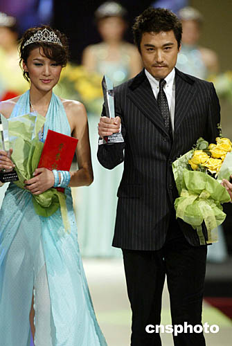中國國際時裝周二零零四年度最佳職業模特獎十一月二十五日晚在北京揭曉,胡兵(右)和韋杰獲此殊榮。中新社記者:盛佳鵬
