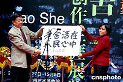 為紀念老舍先生誕辰一百零五周年,由中共廣州市委宣傳部、中國老舍研究會與中國現代文學館聯合舉辦的《老舍文學創作生涯展覽》十一月二十七日在廣州藝術博物院隆重開幕。著名漫畫家廖冰兄先生書寫的《老舍活在人民心中》賀詞由女兒廖凌兒代贈送給老舍先生之子舒乙教授。作者:劉衛勇