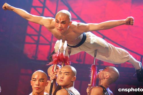 | 由天創(chuàng)國(guó)際演藝制作交流有限公司推出的耗資千萬(wàn)元人民幣的大型常態(tài)功夫劇《功夫傳奇》十二月三日晚在北京首演,本劇以精湛絕倫的中華功夫、賞心悅目的舞蹈,表現(xiàn)了“磨難”與“成長(zhǎng)”的人生主題。圖為《功夫傳奇》中表現(xiàn)鑄練場(chǎng)景。作者:張宇