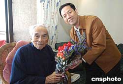 一生奉獻教育事業,親身見證澳門回歸的九十八歲老歸僑梁披云,接受中新社記者采訪時為澳門升平景象感欣慰,當他接過中新社香港分社總編輯周景洛的鮮花時面露喜悅。作者:梁永強