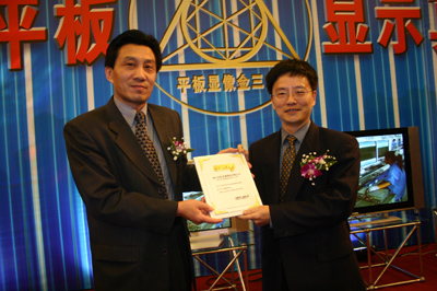 中國電子商會常務副會長王寧(左)向長虹頒發“年度最值得購買的液晶電視”獎牌。魯彥攝
