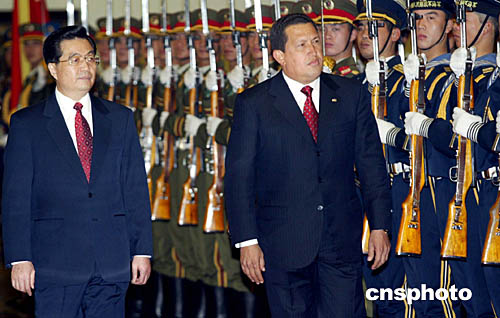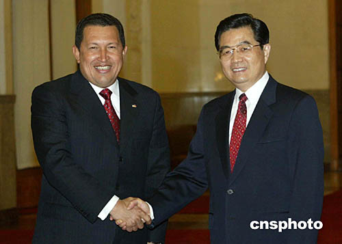 中國(guó)國(guó)家主席胡錦濤十二月二十三日在北京人民大會(huì)堂會(huì)見(jiàn)了委內(nèi)瑞拉玻利瓦爾共和國(guó)總統(tǒng)烏戈·拉斐爾·查韋斯·弗里亞斯。中新社記者:廖文靜