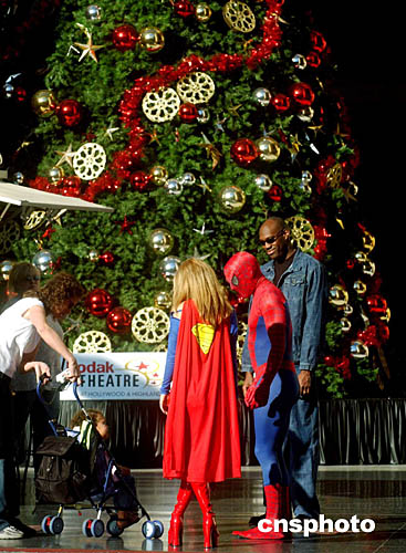 圣誕平安夜的美國洛杉磯好萊塢街頭,扮作電影明星“超人”和“蜘蛛俠”的藝術家與民眾共享圣誕快樂。中新社記者:賈國榮