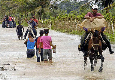 中新網5月26日電 多米尼加西部發生洪水。圖為人們在被洪水淹沒的道路上行走。(固山)