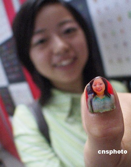 5月26日,一名年輕女性在江蘇展覽館向人們展示以自己形象為圖案的指甲。正在這里舉辦的第七屆美容美發博覽會上展示的最新技術數碼美甲機可以將各種圖案畫在你的指甲上,甚至是你自己或家人的照片。秦淮 攝
