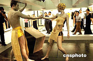 五月二十八日,地處“京西經(jīng)濟帶”核心地區(qū)的“北京華宇時尚購物中心”開業(yè),兩位藝人現(xiàn)場進行人體藝術(shù)表演,為商廈造勢。中新社記者:鄒憲