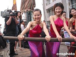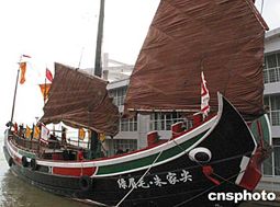 六月四日下午,電視紀錄片《鄭和下西洋》水路拍攝啟航式在南京下關(guān)碼頭舉行。攝制組將沿著鄭和下西洋航線的重要地段進行水路拍攝,重現(xiàn)祖先航海的艱險,尋覓散軼海內(nèi)外的歷史遺存,詮釋六百年來的謎點。圖為“鄭和寶船”的風(fēng)帆徐徐升起。作者:丁東升