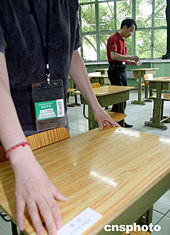 六月六日上午,北京四中考場(chǎng)的監(jiān)考員正在考場(chǎng)認(rèn)真地核對(duì)考生姓名及編號(hào)。中新社記者:張勤