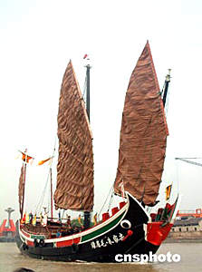 “綠眉毛”仿古木帆船六月八日晚抵達鄭和七下西洋起錨地江蘇太倉劉家港。六月九日上午,太倉市人民政府為“綠眉毛”舉行起錨出海儀式,以紀念近六百年前鄭和七次從太倉起錨。圖為“綠眉毛”駛離太倉海發碼頭。作者:姜振華