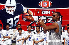 六月十一日,來自美國國家橄欖球大聯盟的明星球員Teyo Johnson在北京對此間參加首屆美式腰旗橄欖球總決賽的中國小運動員進行技術指導。美式腰旗橄欖球是源于美國國家橄欖球大聯盟(NFL)的一項大眾化運動,旨在將美式橄欖球的基礎規則和技巧介紹給全世界八至十四歲的青少年。目前,這項運動在世界三十多個國家的青少年中廣為流行。中新社記者:武仲林