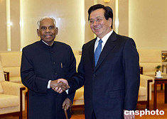 中國國家副主席曾慶紅六月十五日在北京人民大會堂會見前來出席“和平共處五項原則國際研討會”的印度前總統納拉亞南。中新社記者:毛建軍