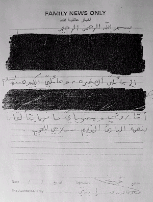 信的開(kāi)頭寫(xiě)道:“以慈悲的神的名義”,接下來(lái)有6行字被劃掉,再往下是“向我的小家庭和大家庭問(wèn)好”,下面又有3行字被劃掉,接下來(lái)的文字是“感謝老天,我的精神很好,我的士氣很高。向所有人問(wèn)好。”。這封信經(jīng)過(guò)了駐伊美軍的嚴(yán)格審查,其實(shí)際內(nèi)容基本已經(jīng)不存在。魯沙旦說(shuō):“三分之二的內(nèi)容被劃掉了,只剩下17個(gè)字,根本無(wú)法理解其原意。”(章田)