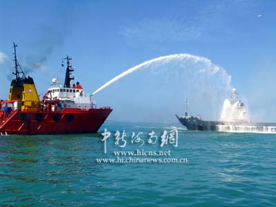 此時,觀摩演習的人們發現,在出事船只周圍,已經有多條各類救助船開始行動,中國救助船“南鷹”輪和“南海救一六八”輪一左一右向燃燒著的遇難船只進行壓制性滅火。兩只泡沫槍和一只高壓水槍對準海難船強制滅火。此時的場面蔚為壯觀,一只高壓水槍激起的水霧在熱帶陽光的照耀下出現了一道漂亮的彩虹。