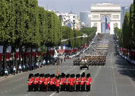 為紀(jì)念英法簽訂“友好協(xié)議”百年,應(yīng)法國方面的邀請,約有百余名英國女王衛(wèi)隊的士兵參加了本次大閱兵,這成為本次法國國慶盛典的一大特色。閱兵式開始前,英法200余名士兵在香榭麗舍大街上向觀眾散發(fā)英、法兩國的小國旗和閱兵計劃傳單。而英國皇家空軍也參加了空中大閱兵的精彩表演。
