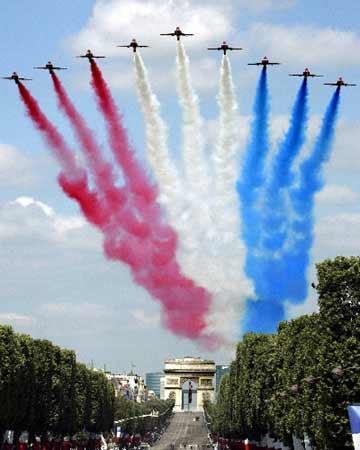 據(jù)法國媒體報道,共有3936名身穿紅色制服、頭戴黑色軟帽的士兵參加了閱兵隊伍。閱兵式動用了64架戰(zhàn)機,31架直升機,51個方隊,305輛軍車,83輛摩托,310匹戰(zhàn)馬和350名軍樂手。