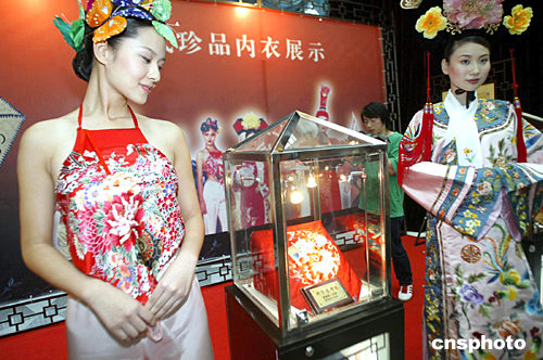 7月27日,大型后現代多媒體舞臺劇《尋衣記——云縷心衣歐迪芬》在北京舉行新聞發布會,主創人員及部分演員與媒體見面,更有清代珍品內衣展以及身著古裝的模特為新聞發布會助興!秾ひ掠洝穼⒂7月30日、31日在北京保利劇院上演。中新社記者:盛佳鵬
