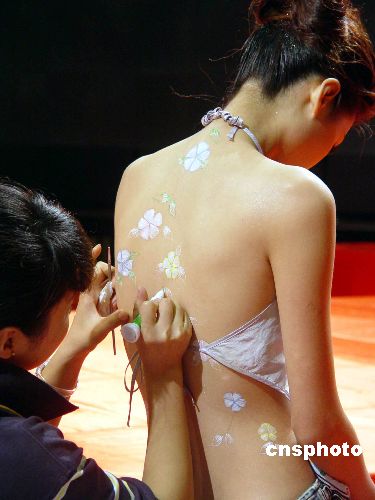 2004年8月7日,南京市某商家在其新產(chǎn)品推介會上,再次請來模特現(xiàn)場彩繪秀,以吸引消費者眼球。作者:王耀武