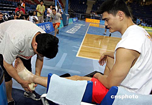 “姚明來了!”一聲聲欣喜的驚呼后,各路老記從不同的方向奔向已在休息長椅上坐下的姚明。姚明在隊醫的協助下往腳上裹纏紗布的畫面被無數的照相機和攝影機攝入鏡頭。