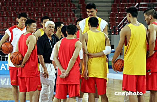 當滿頭銀發的中國男籃主帥哈里斯姍姍出現在訓練館內時,隊員們開始集合,此時比預定的訓練時間晚了半個多小時。在例行的熱身活動后,中國男籃分成黃、紅兩隊進行了幾套戰術的演練。由姚明、易建聯、李楠、劉煒、朱芳雨等組成的黃隊無疑是中國男籃的主力陣容。