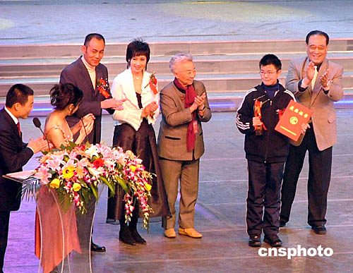 第七屆中國長春電影節一月十二日晚在長春落幕,年僅十六歲的鐘秋(右二)因在《我的法蘭西歲月》中成功飾演少年鄧小平一角,而獲得“新銳人物獎”。作者:吳兆飛