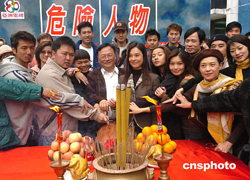 香港電視劇《危險人物》19日在香港亞洲電視臺舉行開鏡拜神儀式﹐劇組制作總監梁立人和節目主持人翁靜晶及劇組全體人員到場誠心拜神﹐祈求拍攝順利。中新社記者:趙振清