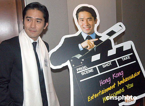 連任香港影視娛樂大使的梁朝偉,與其宣傳紙板肖像合照。作者:鄧慶樂