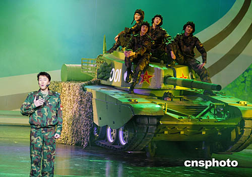 活躍在全國各種舞臺的解放軍歌唱演員蔡國慶,在北京中國劇院參加2005年軍民迎新春文藝晚會演出時,坦克徐徐開動為其伴舞,形成獨特的舞臺情景。中新社記者:王麗南