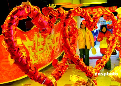 2月13日,一些消費者從南京某商場用“心”打造的通道旁走過。當天是情人節(jié)前夜,南京的商場、花店和街頭處處彌漫著浪漫的氣息,商家們都在別出心裁地用“心”打造情人節(jié)市場。 作者:王新