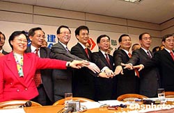 香港政團民建聯與港進聯16日召開記者會宣布合并,成立“民主建港協進聯盟”,簡稱則仍叫民建聯。作者:譚達明